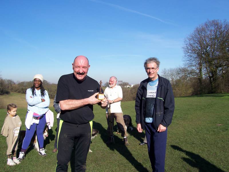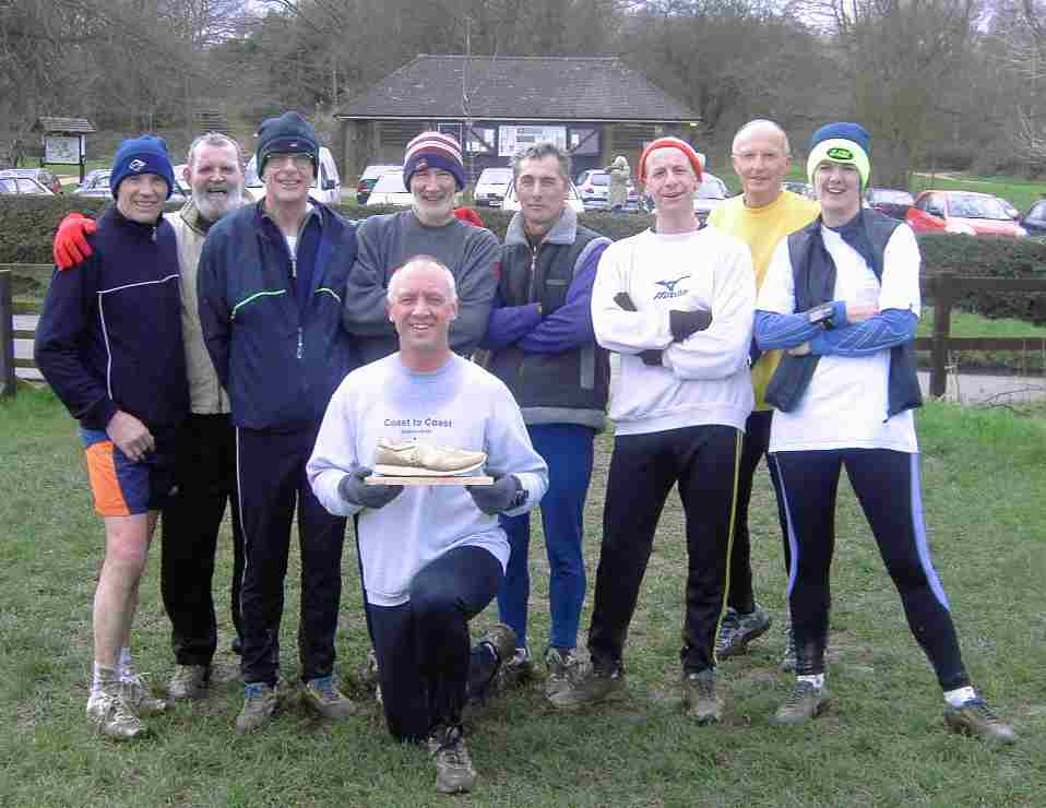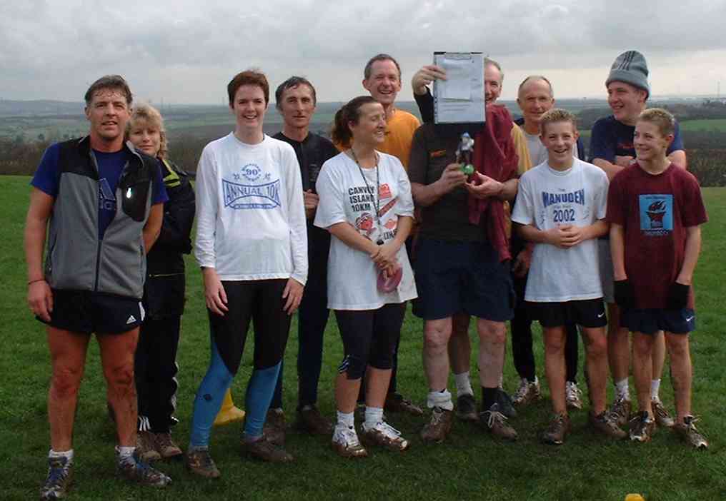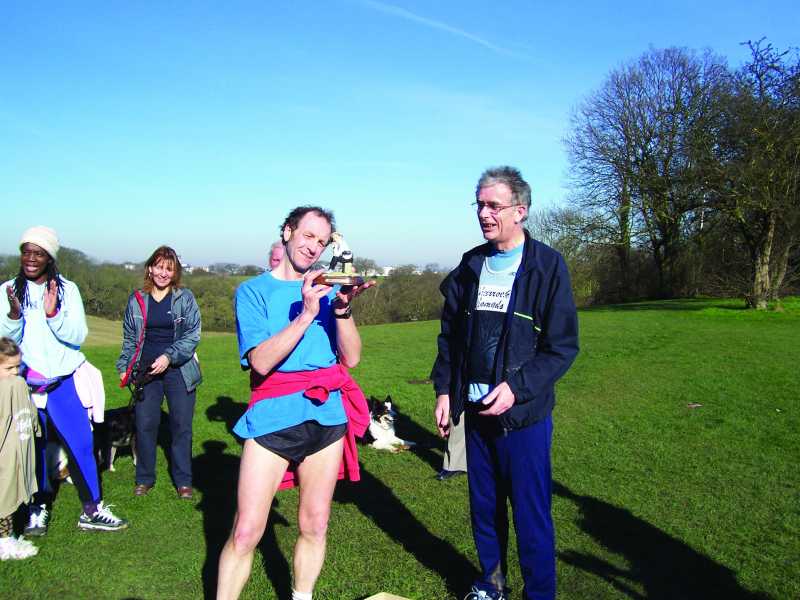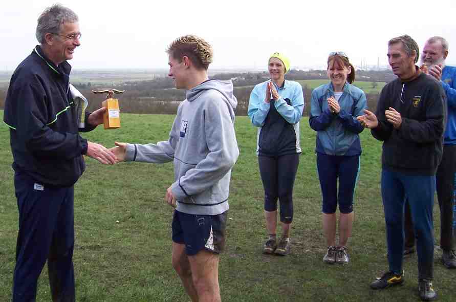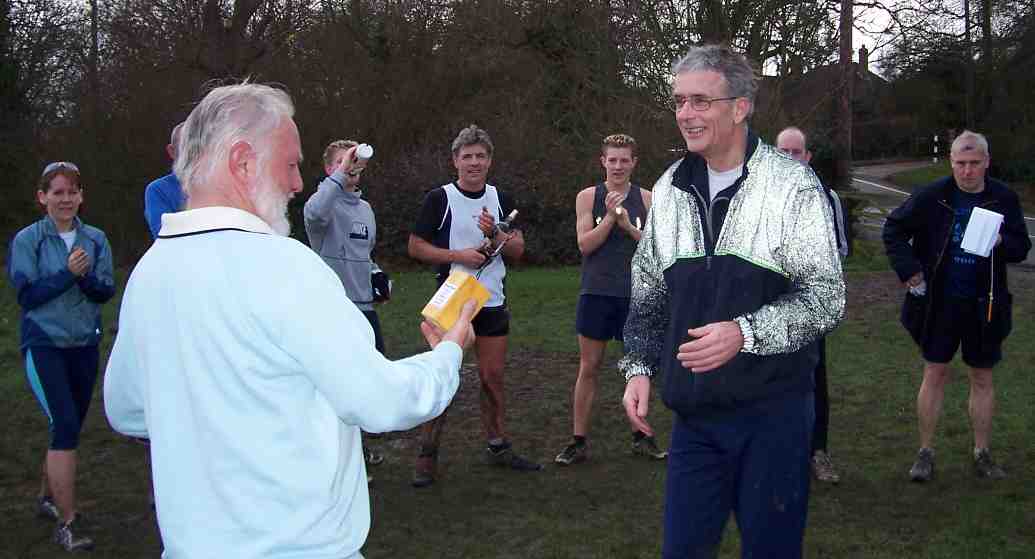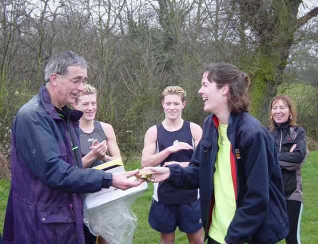 Chris Milne the worthy winner this year proudly holds the trophy. He managed to cut his way from the back and overtake everyone else in the race despite furious cheating by two nameless slower runners (centre of back row!) Make the most of this years success Chris, very few people manage to fool the handicapper twice... Thanks to Teresa, Linda and Dave for standing around in the cold timekeeping (and trying to recognise their clubmembers at the finish...) |